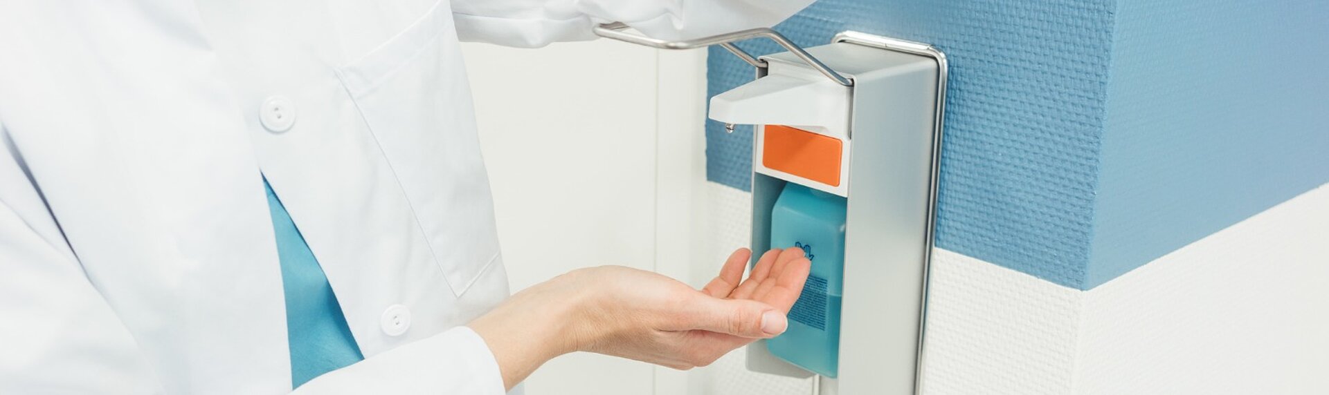 Sie finden bei uns in der Klinik in den Eingangsbereichen, in allen Stationseingängen sowie in den Patientenzimmern Desinfektionsmittelspender.