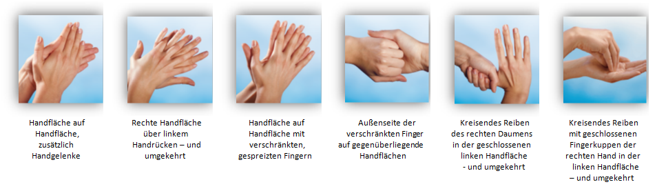 Zur Desinfektion wird Desinfektionsmittel aus dem Spender entnommen und gemäß der 6 Schritte in die trockenen Hände eingerieben. Bei der Händedesinfektion sollte darauf geachtet werden, dass die Hände komplett mit dem Desinfektionsmittel benetzt sind. Eine Hilfestellung dazu bieten die 6 Schritte der Händedesinfektion.